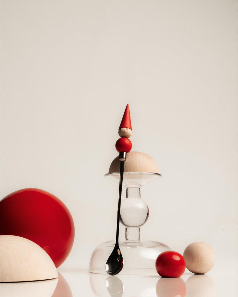 Denne skjeen med langt skaft er laget av rustfritt stål, og nissen er håndlaget av lønneperler.