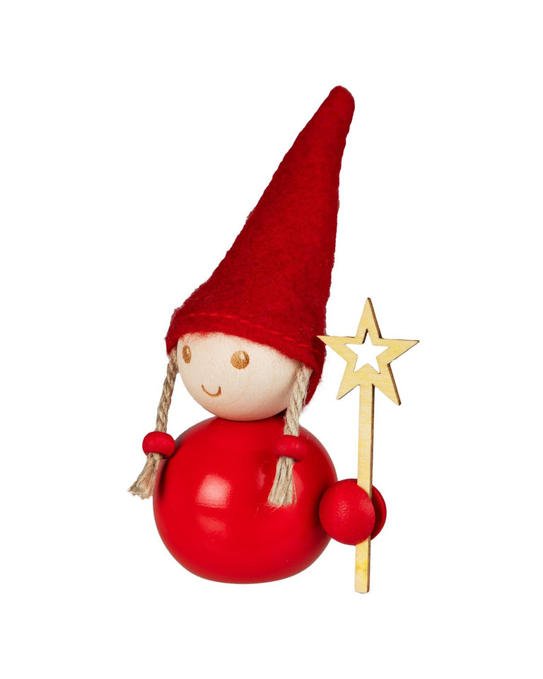 Den røde nissejenta, stjernebæreren, er laget av lønneperler, iført en rød hette og holder en stjerne