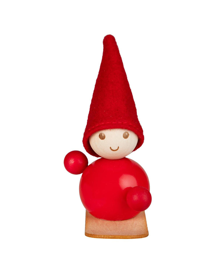 Den røde Nisse Snowboarderen er laget av lønneperler, den har en rød hette og balanserer på et snowboard av tre.