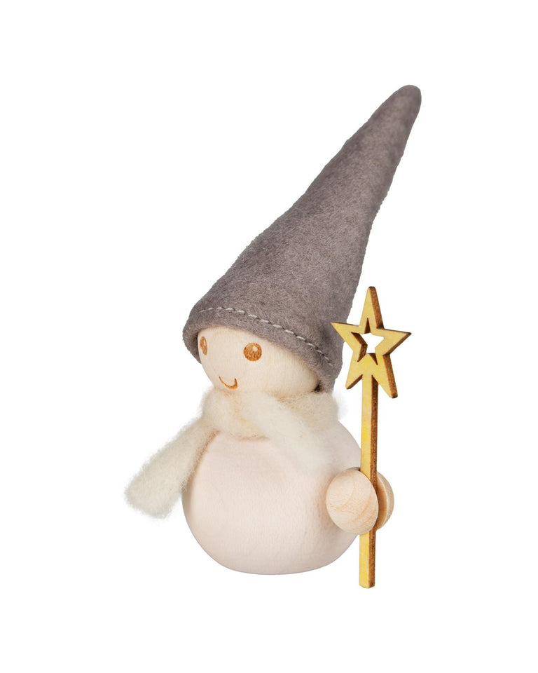 Den hvite frostnissen, stjernebæreren, er laget av lønneperler, iført en grå hette og holder en stjerne.