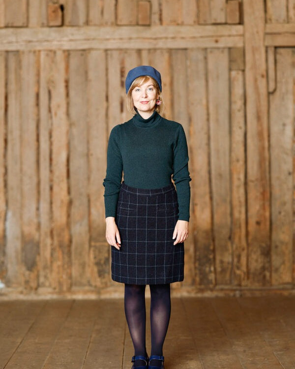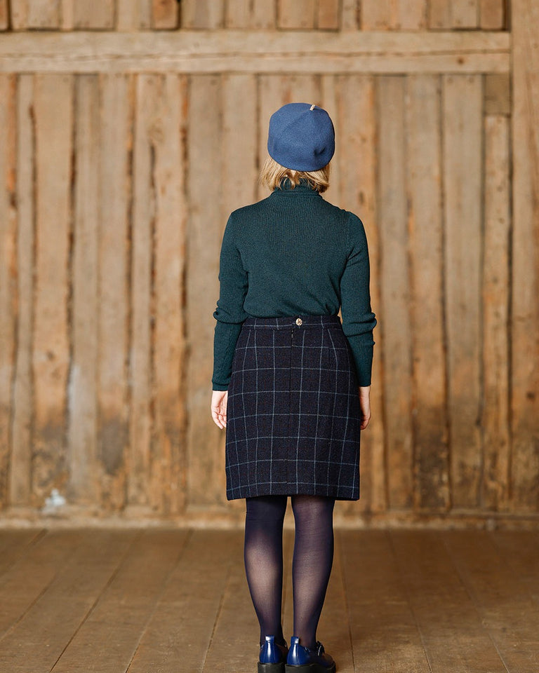 Enkelt og nydelig skjørt sydd i Shetlandsull. Klassisk og velsittende med ruter i blå nyanser.
