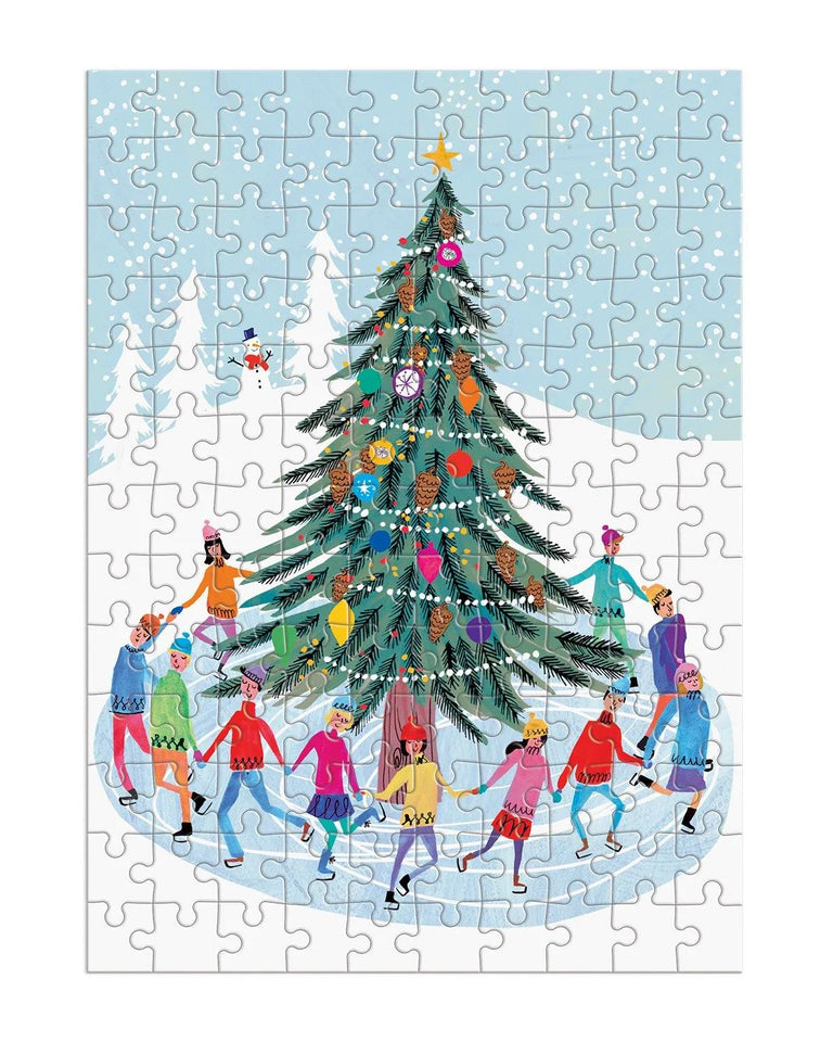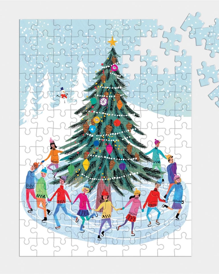 Tree Skaters 130-biters puslespill fra Galison er både en pynt til å henge på treet og et minipuslespill. Puslespillet har en fargerik illustrasjon av skøyteløpere som sirkler rundt et fargerikt dekorert tre. Puslespillbrikkene er pakket i en sjarmerende liten huspynt dekorert til høytiden. Pynten inkluderer en rød snor til oppheng. En perfekt gave!