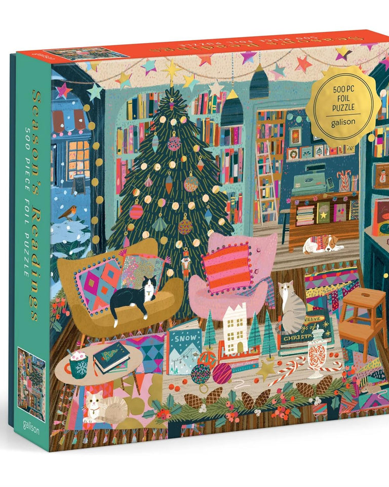 Galisons «Sesongens lesninger»-puslespill med 500 brikker i folie har en koselig julescene fra den lokale bokhandelen, forbedret med glitrende gullfoliedetaljer.