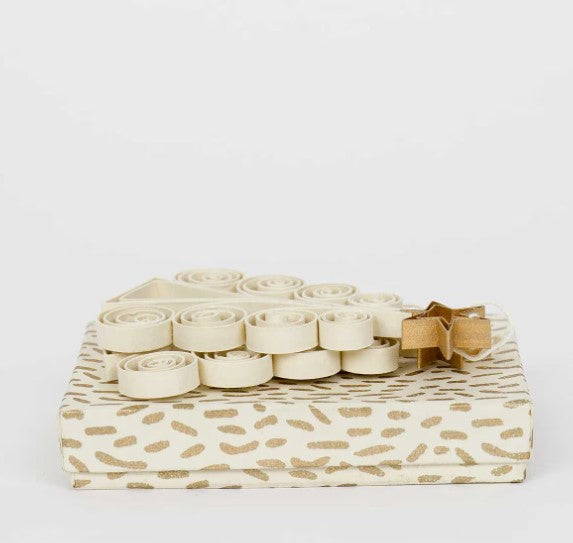 Juletrær laget av håndlaget papir. Teknikken som brukes her er "quilling".