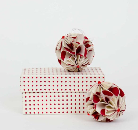 Afroart julekuler med blomster i papir, 2 pakk. Kulene har en gullprikk i midten av hver "blomst".