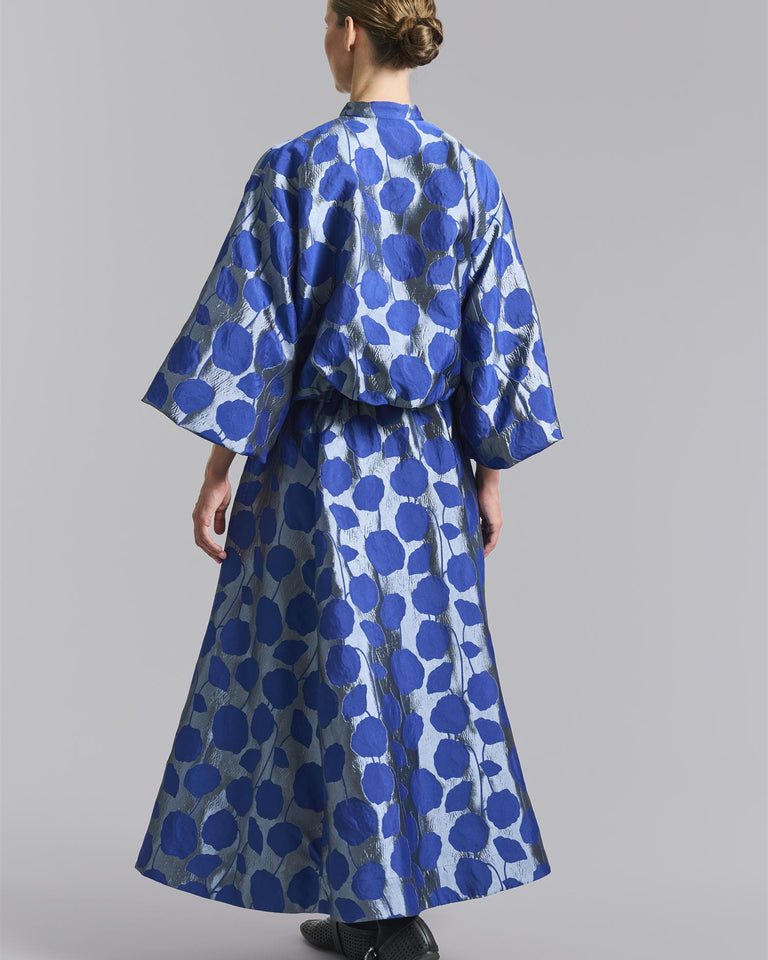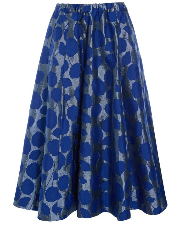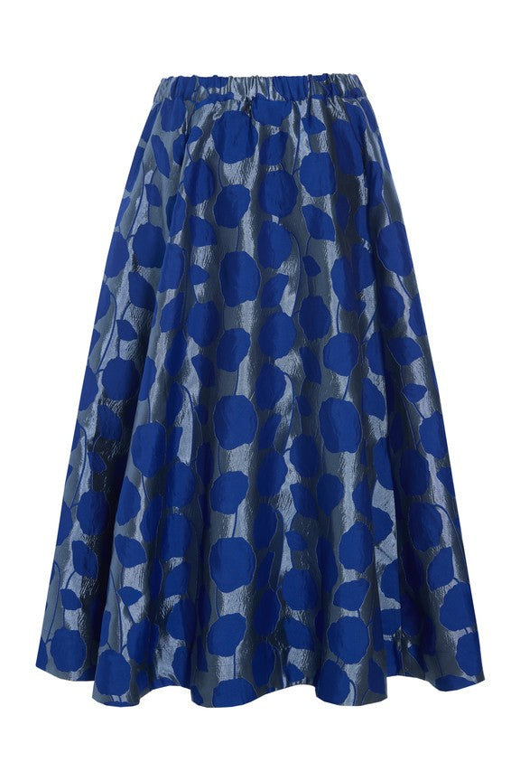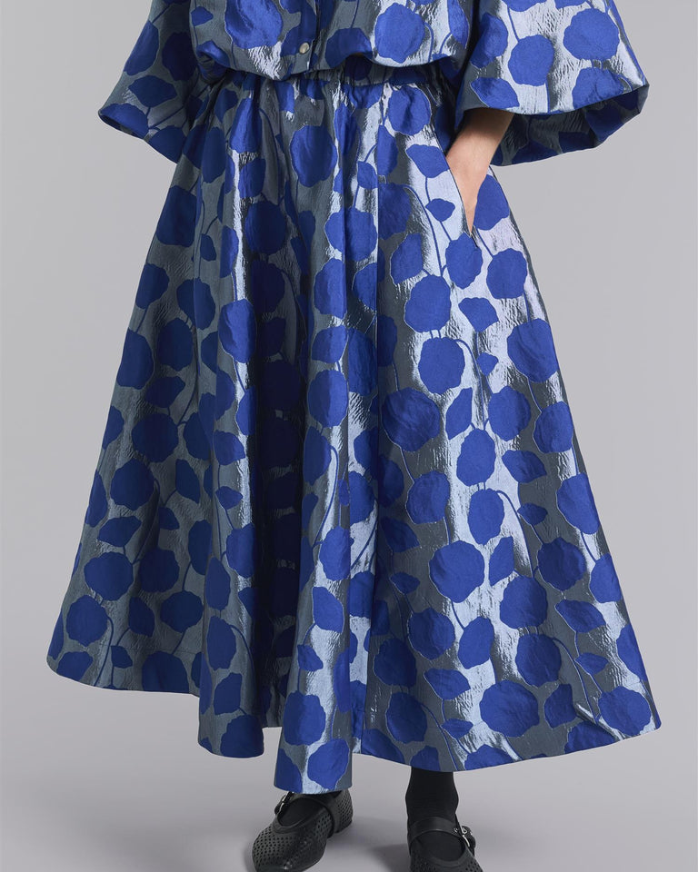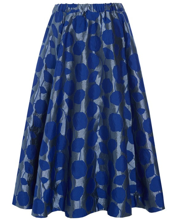 Skjørt i det vakreste, skinnende jacquardstoff utstyrt med grafiske blomsterankere. Stoffet er relativt kraftig og gir et fantastisk volum til skjørtet. Et skjørt som vil gjøre hverdagen festlig og festen ekstra elegant.