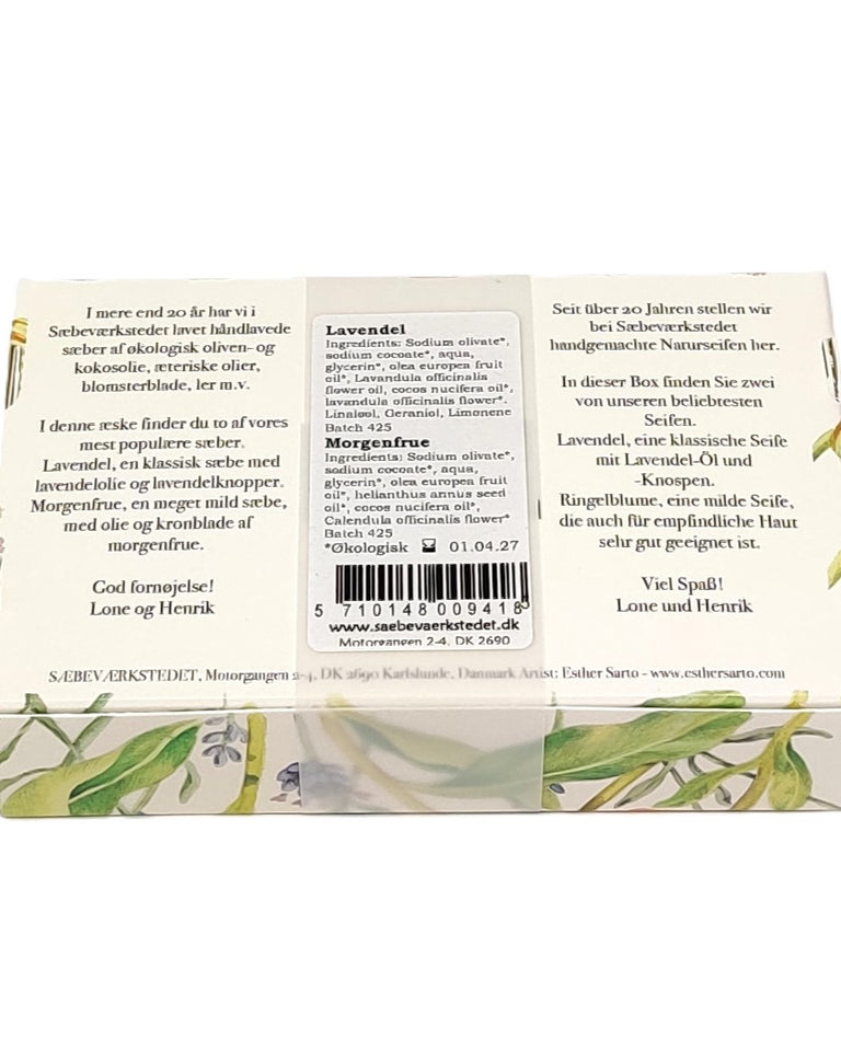 I denne esken finner du to populære såper. Lavendel, en klassisk såpe med lavendelolje og tørkede lavendelknopper. Morgenfrue, ringblomst på norsk, er en veldig mild såpe, med ringblomstolje og kronblader.