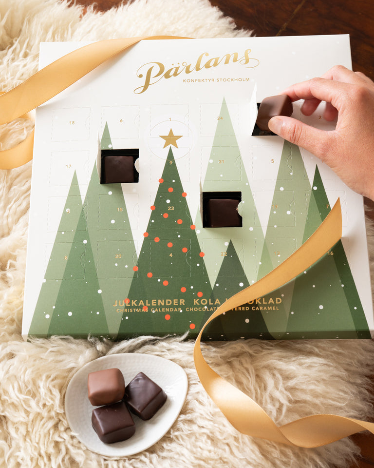 I år går vi tilbake til tradisjonen og gir deg en adventskalender med 24 biter myk karamell dyppet i mørk eller lys økologisk sjokolade. Bak dørene finner du en ny smak hver dag av nøtteaktige, salte, søte, fruktige, krydrede, barnslige og klassiske sjokoladekarameller. Hver dag før jul byr på en liten, forsvinnende smakfull overraskelse.