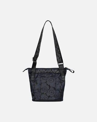The Carry All Unikko shoulder bag has a zipper closure, a handle, and an adjustable, jacquard knit Unikko pattern shoulder strap. There is an open pocket on the inside and an open pocket on the outside. The Marimekko keychain is attached to the front.