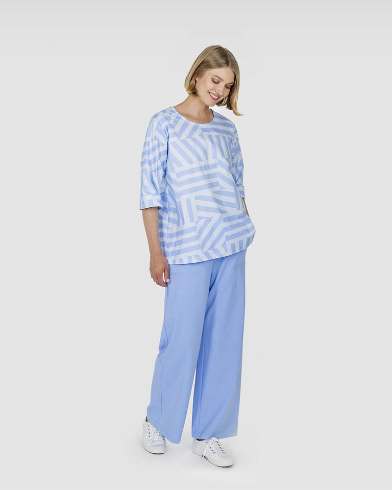 MIINUS-toppen er laget av høykvalitets og behagelig mykt, trykt bomullsstoff med litt elastan for å gi stretch. Det blåtonede Suuntaraita-trykket er designet av Pihla Prittinen. Den ganske løstsittende toppen utvider seg litt nede og har en rund hals. Ermene, som går over albuene, har brede oppbrett som kan brukes til å justere ermelengden. MIINUS-skjorten er designet i Finland og produsert i Estland.