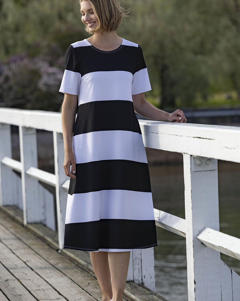 Den lange, sommerlige TARINA-kjolen er laget av en svart-hvit stripete jersey med litt elastan for å gi stretch. Materialet føles veldig behagelig mot huden. Kjolen er smal på skuldrene og vider seg ned. Den har korte ermer og rund halsutringning, samt lommer i sidesømmene. TARINA-kjolen er designet i Finland og produsert i Litauen.