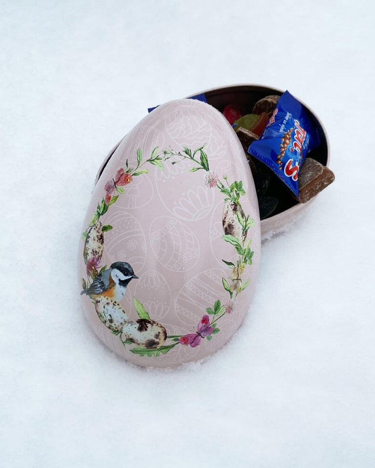 Påskeegget er laget i tinn og kan tas frem år etter år. Det er og nydelig som dekor. Kan åpnes og legges godteri i! Håndvask, tørkes grundig.