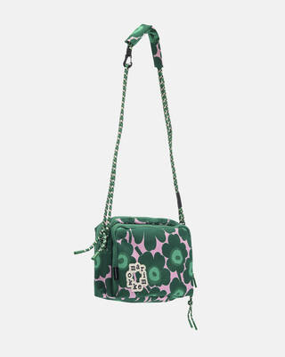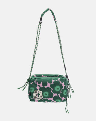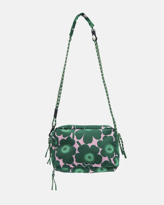 Kavari skuldervesken er dekorert med Mini Unikko-mønsteret. Vesken har tre lommer, alle med glidelåslukking. Den fremste lommen har en nettinglomme innvendig i tillegg. Vesken har en tausnor med polstring på skulderen for ekstra komfort. Skulderstroppen er avtagbar og kan stilles inn. Den sirkulære Marimekko-logoen på fremsiden av vesken er laget av resirkulert silikon.