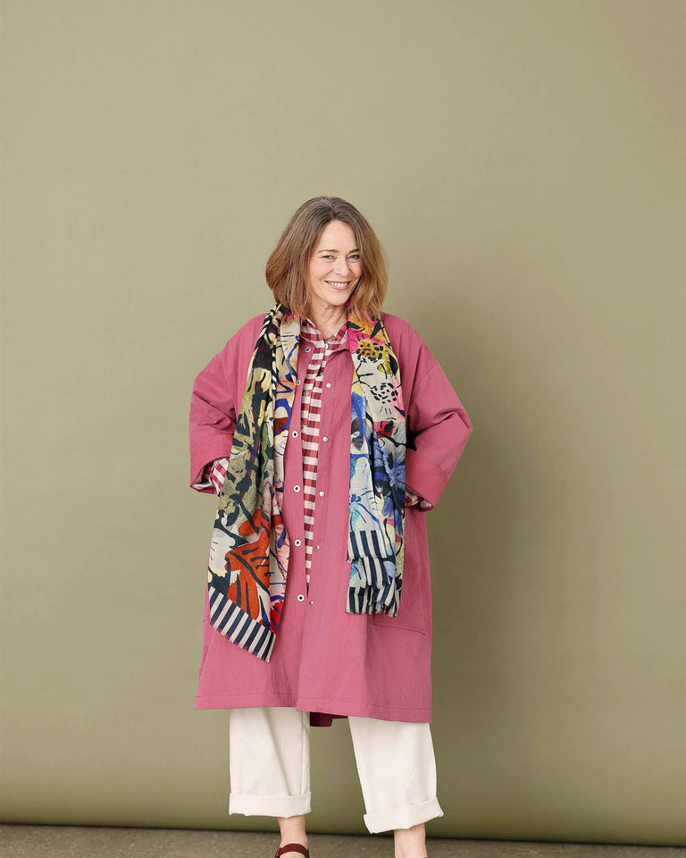 Superfin vårkåpe med oversized passform og trykknapper, i en A-formet silhuett. Frakkens A-snitt er holdt rent og enkelt med en klassisk, skarp krage. Foran har kåpen to store påsydde lommer. Disse lommene har plass til mye; over kanten av en stor lomme er det en liten ekstra lomme. Det er også en innerlomme. Innvendig er kåpen fôret med et grafisk mønster designet av Juliane. Kåpen lukkes med fine trykknapper med et hull i midten. Med en genser under kan denne kåpen– som også er vindtett og vannavvisende – lett bli en kåpe du bruker hele året. Frakkens overflate er matt, noe som gir frakken et elegant og sofistikert utseende.