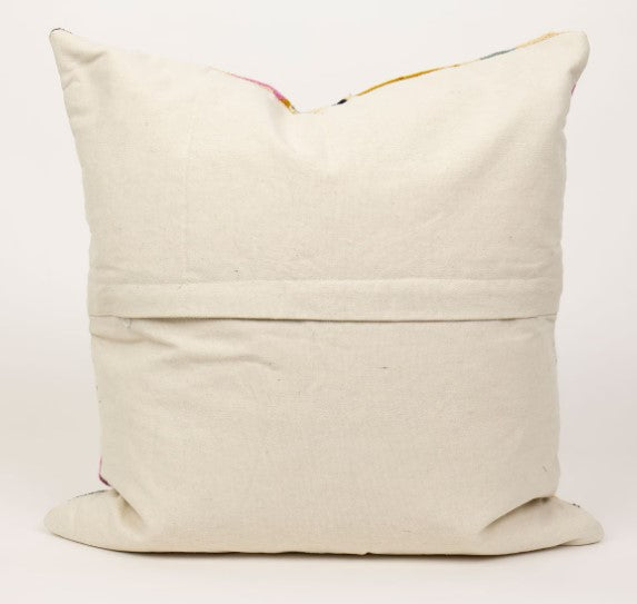Den firkantede puten fra India har håndbroderte kjedesting som dekker hele overflaten. Den er produsert i Kashmir-regionen i Nord-India. Den mønstrede forsiden er i 100 % ull og baksiden er i hvit, ubleket bomull.