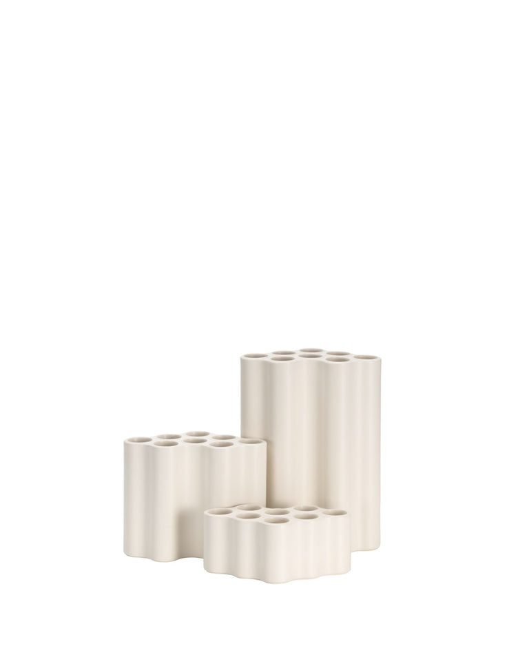 De skylignende vasene Nuage i keramikk fra Vitra ble lansert i 2018, og er designet av den verdensledende designduoen og brødrene Ronan & Erwan Bouroullec. Med et designmønster som minner om skyer, kan vasen monteres i utallige kombinasjoner for å skape forskjellige skyformasjoner. Vasene har åtte rørformede hulrom der du kan plassere vakre arrangementer av gress og blomster. Her i middels størrelse.