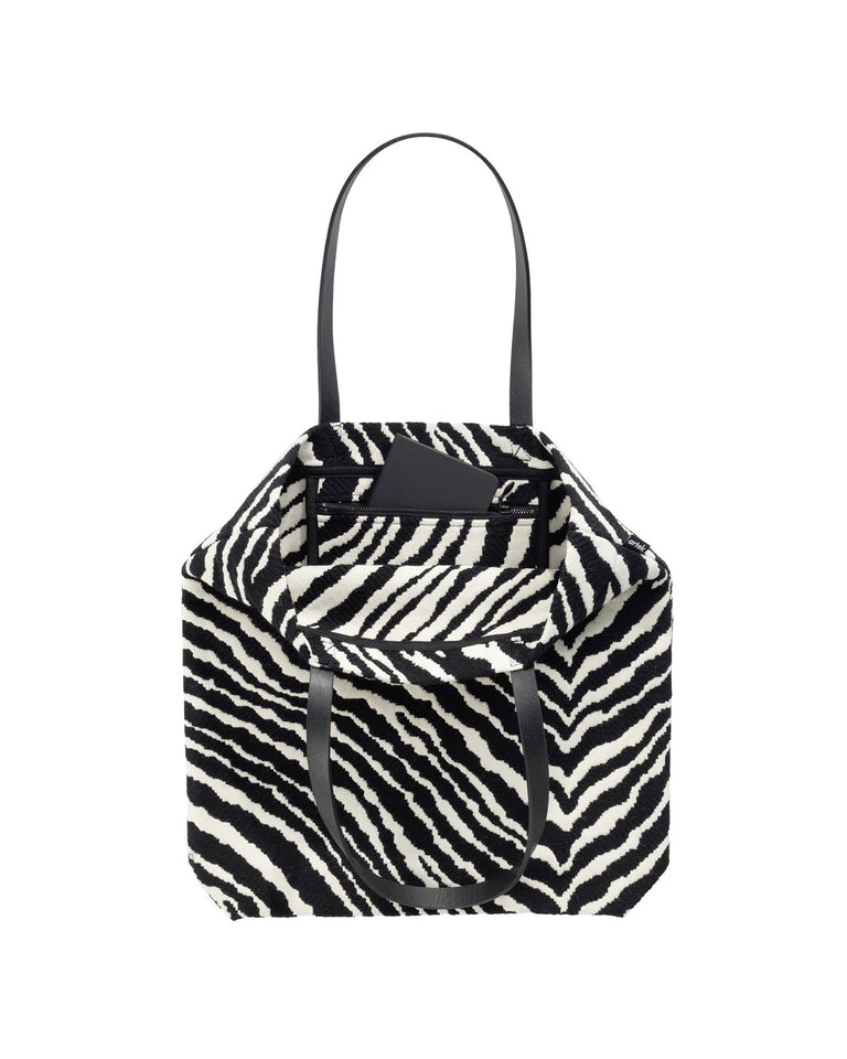 Veske med skinnhanker i det klassiske sebramønsteret. Innerlomme med glidelås. Mønsteret har vært en del av Arteks kolleksjon siden 1930-tallet. Det var Aino Aalto som forelsket seg i mønsteret på en av sine mange reiser.