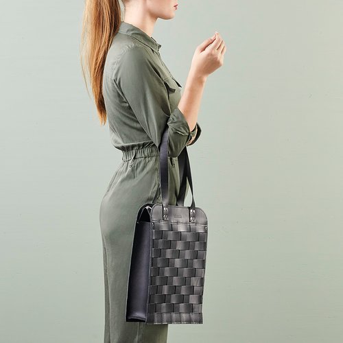 Big Shoulder Bag er hovedverket i Näver-samlingen til Eduards Accessories med sin karakteristiske neverfletting på veskens framstykke. Bakstykket er i glatt skinn. Vesken har et stort rom og en liten innerlomme med glidelås. Vesken i seg selv lukkes med en topp-glidelås.