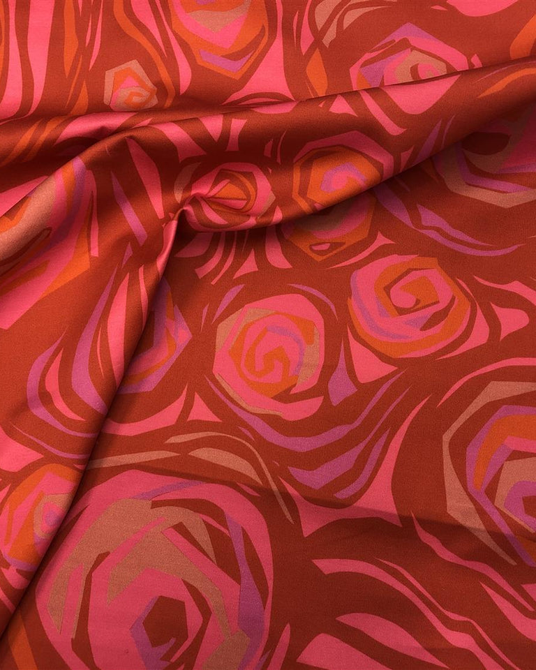 Satengvevd bomull med mønsteret Ruusu. Formgitt av den kjente finske tekstildesigneren Marjatta Metsovaara i 1962.