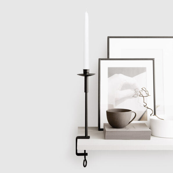 Høy Tving er lett å feste på en hylle, bordplate eller vinduskarm. Basen har en utskiftbar lysestake for kronelys.