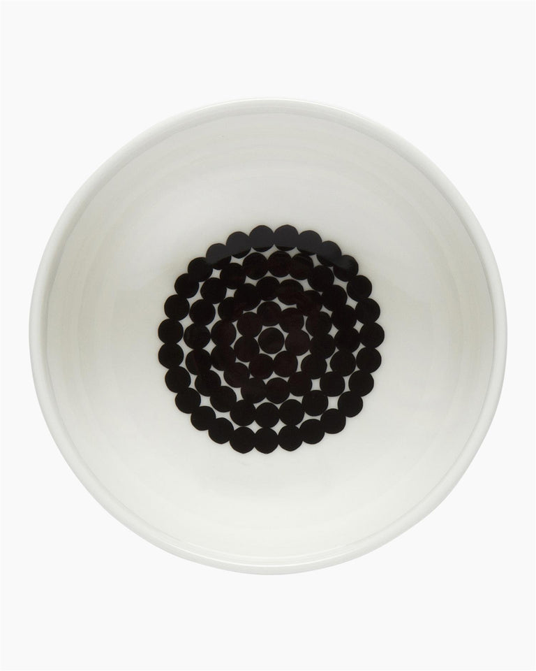 Denne lille Oiva-risbollen er dekorert med det svarte og hvite Räsymatto-mønsteret og den er laget av hvitt steintøy som tåler oppvaskmaskin, stekeovn, mikrobølgeovn og fryser.
