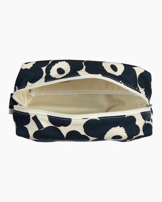 Den store kosmetikkvesken Vilja er laget av kraftig bomull og lin og er dekorert med Mini Unikko-mønsteret, som er trykt i Helsinki. Vesken har glidelåslukking, smussavvisende på stoffet og nylonfôr. Det er to lommer og plasser for børster inni.
