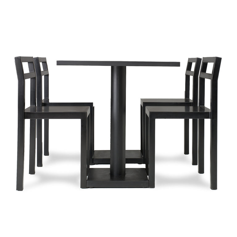 Bordplaten er 65x65 cm. Det finnes også et rundt bord, og tilhørende stoler og benk.