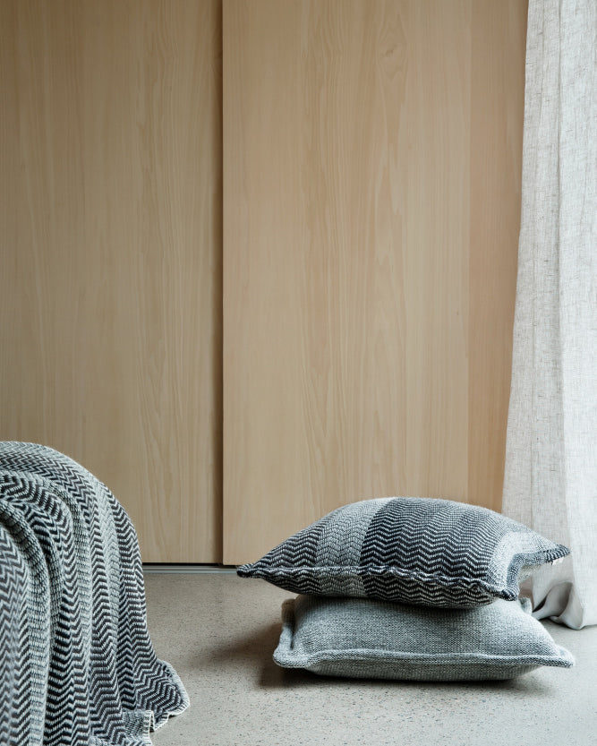 Fri pledd og puter er inspirert av de tradisjonelle løperne man finner variasjoner av rundt om i nesten hver fjellhytte i Norge. I denne nye tolkningen er den typiske repeterende fargerytmen noe oppløst og fargene skifter i en randomisert, myk og slyngende sikksakk.
