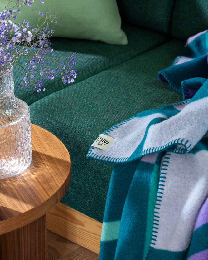 I kolleksjonen «City» som Birkeland har designet for Røros Tweed, viser hun en grafisk variant av sitt eget håndlagde fletteverkmønster – overført til vev i fire forskjellige fargeskalaer; pastell, mint, oransje og aqua.