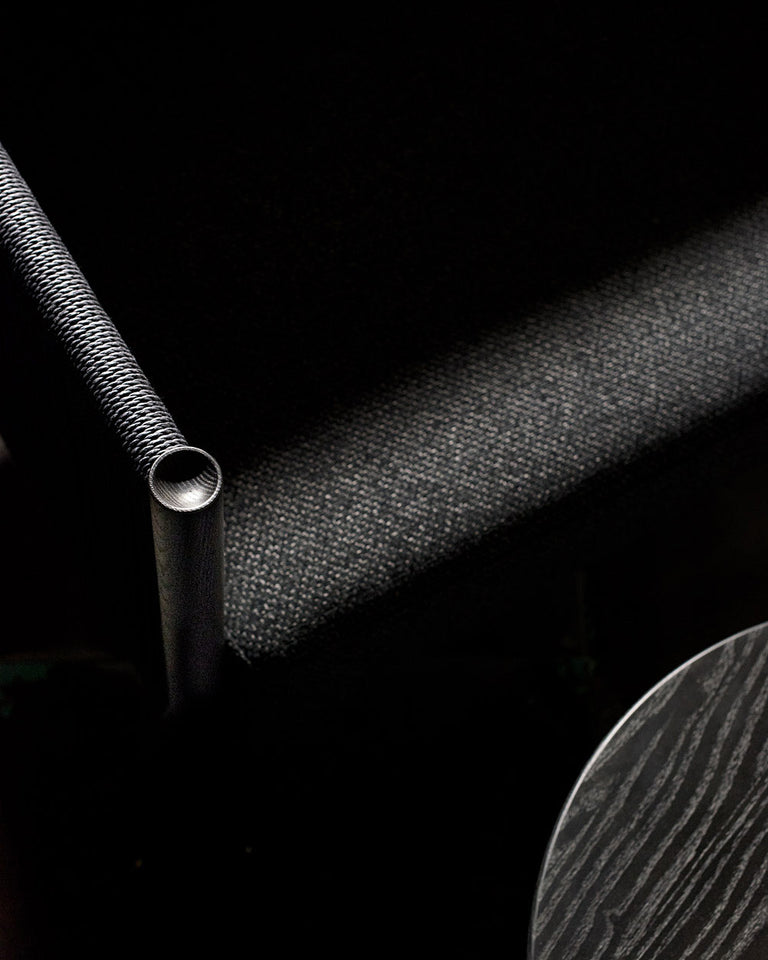 Designet i samarbeid med Studio MK27, er de repeterende pinnene på ryggen og de papirsnorflettede armlenene inspirert av mønstre som finnes i klassiske bambuskonstruksjoner og tatamimatter.