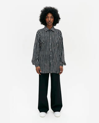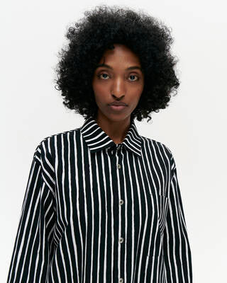 Jokapoika-skjorten er en unisex-skjorte dekorert med det svarte og hvite Piccolo-mønsteret. Det er en skjorte med løs passform med rett kutt til hoftekanten med små sidespalter og en påsydd brystlomme. Metallknapper sikrer frontlukking og mansjetter.