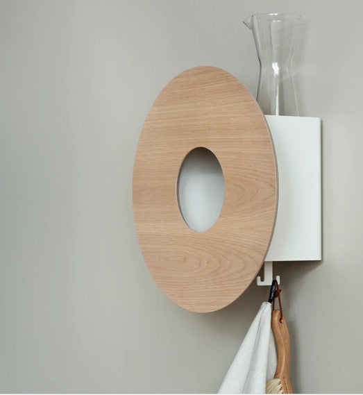 Det sirkulære frontpanelet skjuler to hyller, en på innsiden og en på toppen. På bunnen er det 4 praktiske kroker.
