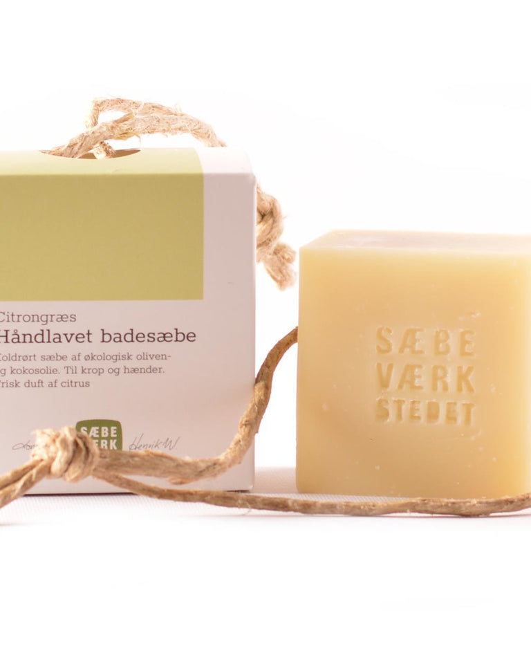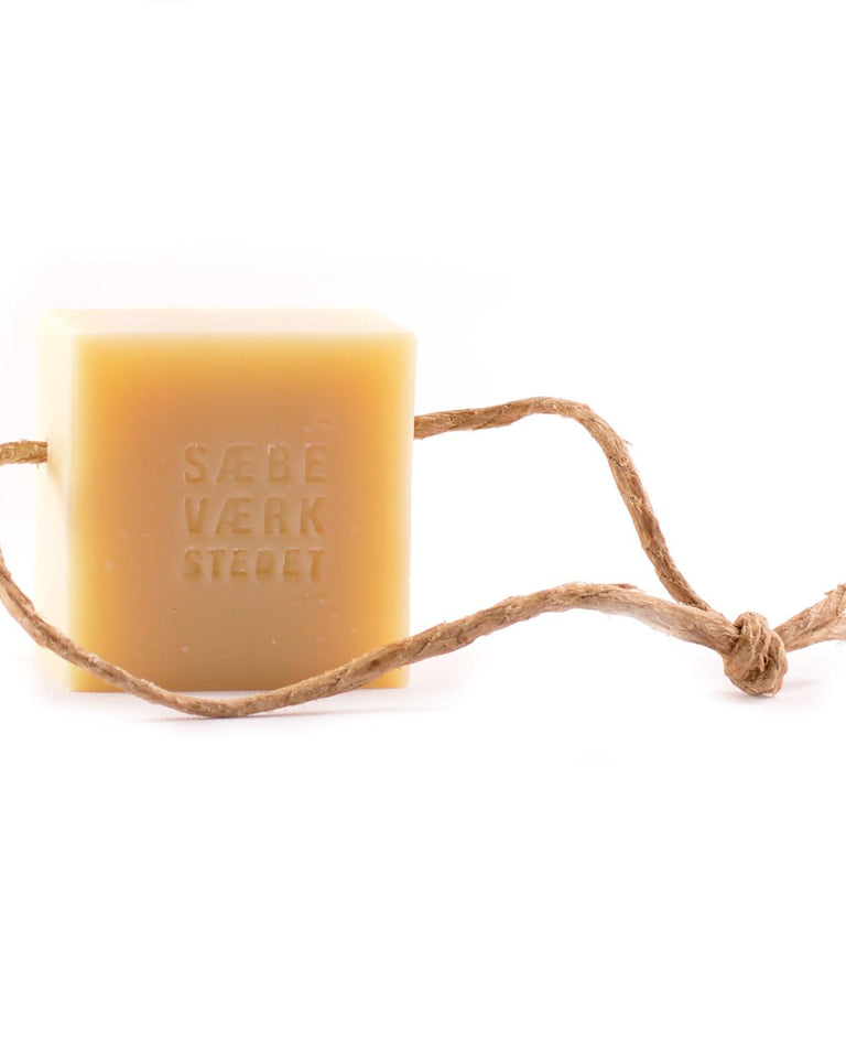 Denne såpen henger på en snor som trekkes gjennom såpen. Den er praktisk å ha med i badekaret, og henger den på en krok holder den bedre, for såpe har best av å tørke gjennom når den først er brukt.