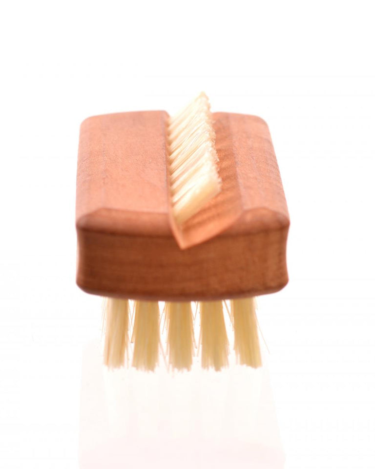 Børstene på den ene siden er egnet for å skrubbe håndflatene helt rene. På oversiden er en enkelt rad med skrå børster gode for å komme under neglene.