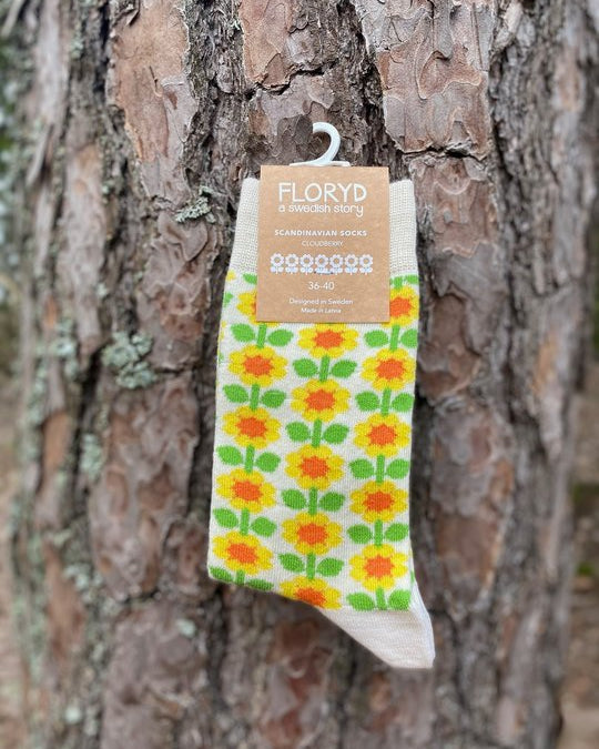 Sokker i svensk design. Herlig retro! Elastisk modell, passer størrelse 36-40
