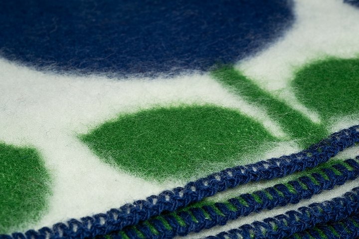 Ullpledd i myk, lekker ull (ull fra Norge) som kan brukes til de minste, eller til kjæledyr. Ullteppe BLÅBAR RETRO inspirert av skandinaviske skoger og 60-tallet, perfekt for frosne kvelder. Teppet er jacquardvevd og fargene er omvendt på den andre siden. Vevd i Litauen og laget av fin myk ull fra Norge (480 g/m2).