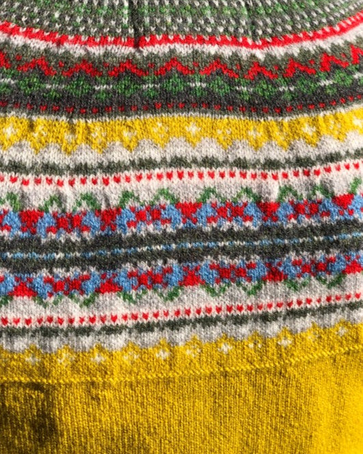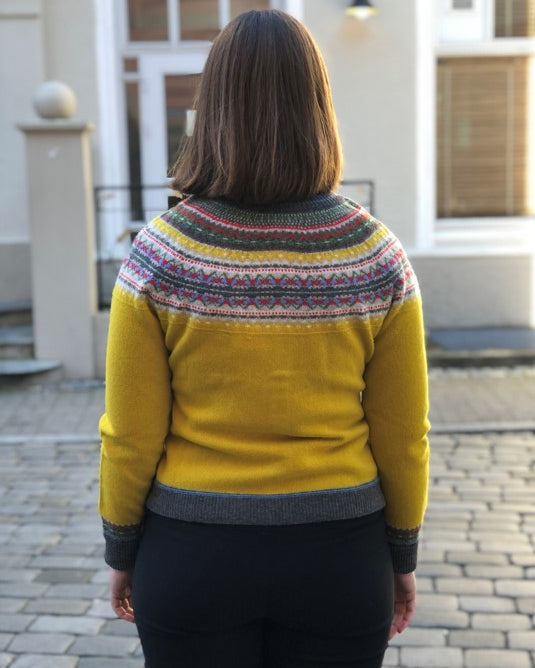 Deilig, kort cardigan med mønsterdetalj på skuldrene. En litt kortere modell med ekstra lange mansjetter og perlemorknapper. Flott å kombinere med både bukser, skjørt og kjoler