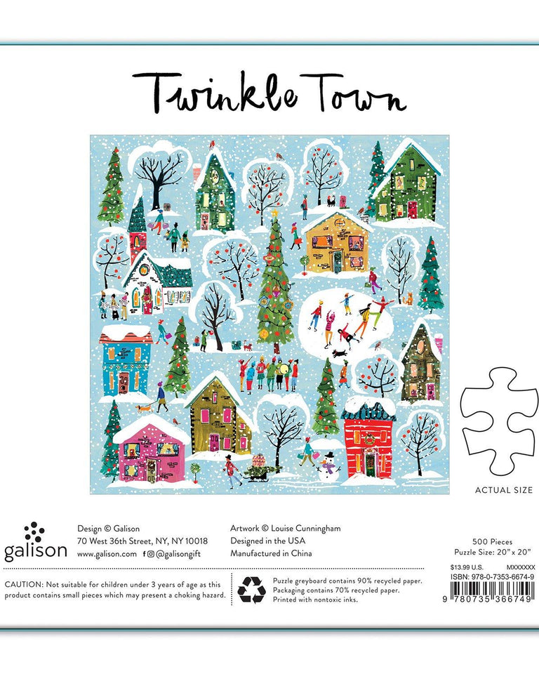 Puzzle fra Galison har en snodig illustrasjon av en snødekt by midt i ferieaktiviteter. Galison-puslespill er pakket i solide esker. Perfekt for gaver, gjenbruk og oppbevaring.