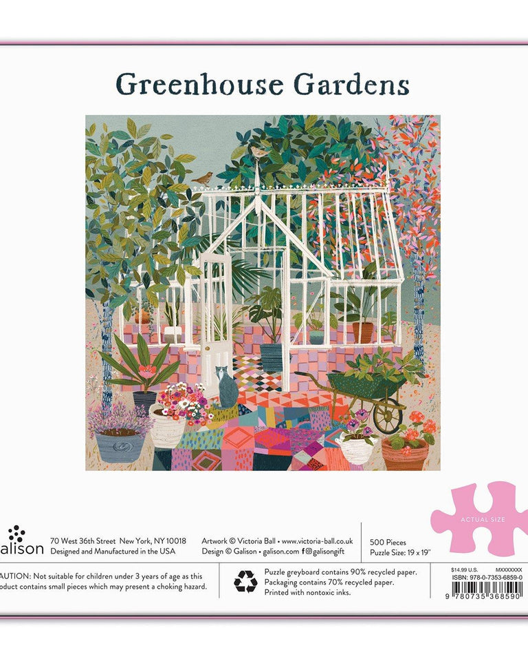 The Greenhouse Gardens 500 deler Puzzle har sjarmerende og fargerik illustrasjon av en gartner sitt drivhus. Puslespillene er pakket i en solid boks, perfekt for gaver, gjenbruk og oppbevaring.