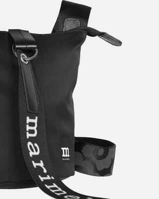 The Essential Bucket shoulder bag is made of recycled nylon. The small bag has a zipper closure and an adjustable shoulder strap with the jacquard knit Unikko pattern. The front features the Marimekko keychain and there is a slip-in pocket in the back. The bag has leather details.
