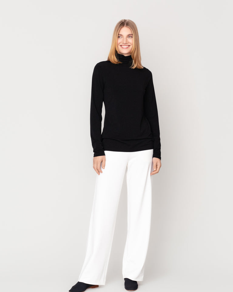 NOKI-toppen har en elastisk dobbel krage og ermer i full lengde. Den smale toppen passer godt under jakker eller med løstsittende bukser. Materialet er høykvalitets og lettstelt viskoseulljersey.