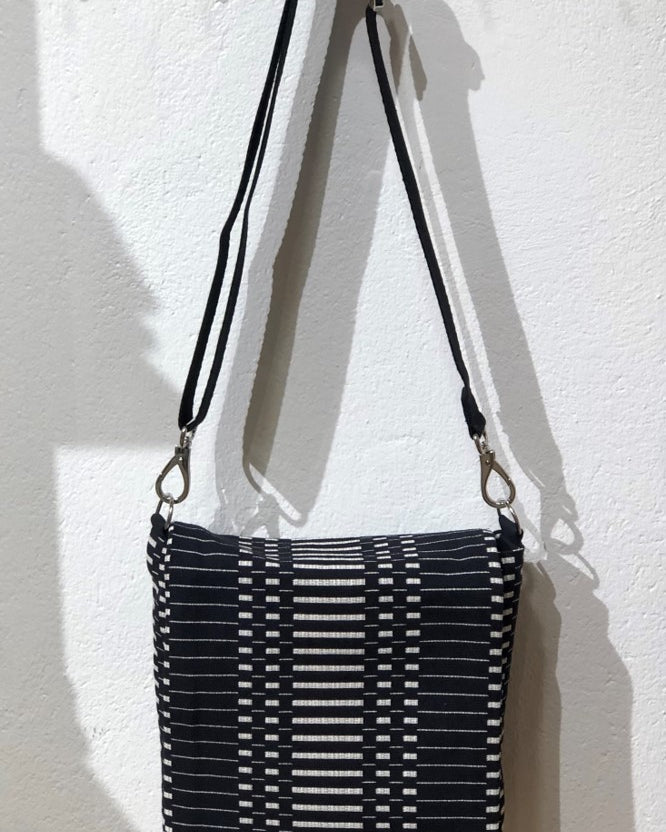 Stilig veske i bomull med Johanna Gullichsens karakteristiske mønster Helios i svart. Den justerbare skulderstroppen kan byttes ut. To innerlommer, én med glidelås.