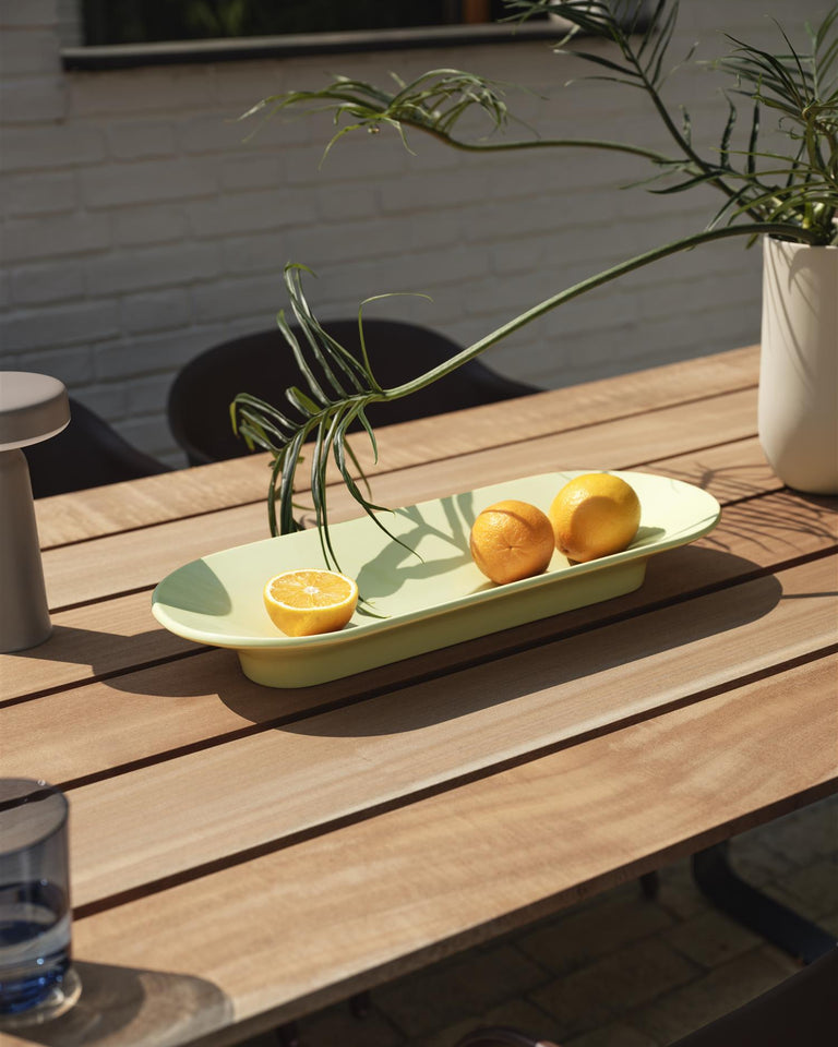 Mere Bowl er et skulpturelt midtpunkt og ser vakker ut på et bord eller i et rom enten det er i bruk eller ikke. Dens karakteristiske form er enkel, men likevel praktisk ettersom en linje ned langs midten folder seg ut til sidene og danner en bolle. Hevet av en diskret fot ser det ut som om det flyter. Produsert i taktilt keramisk steintøy, har den blitt belagt med en høyglansglasur som forsterker skyggene som dannes langs Mere Bowls fold. Denne overflatebehandlingen gjør bollen trygg til mat.