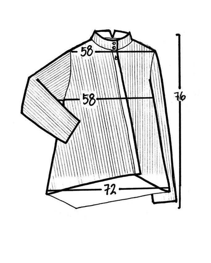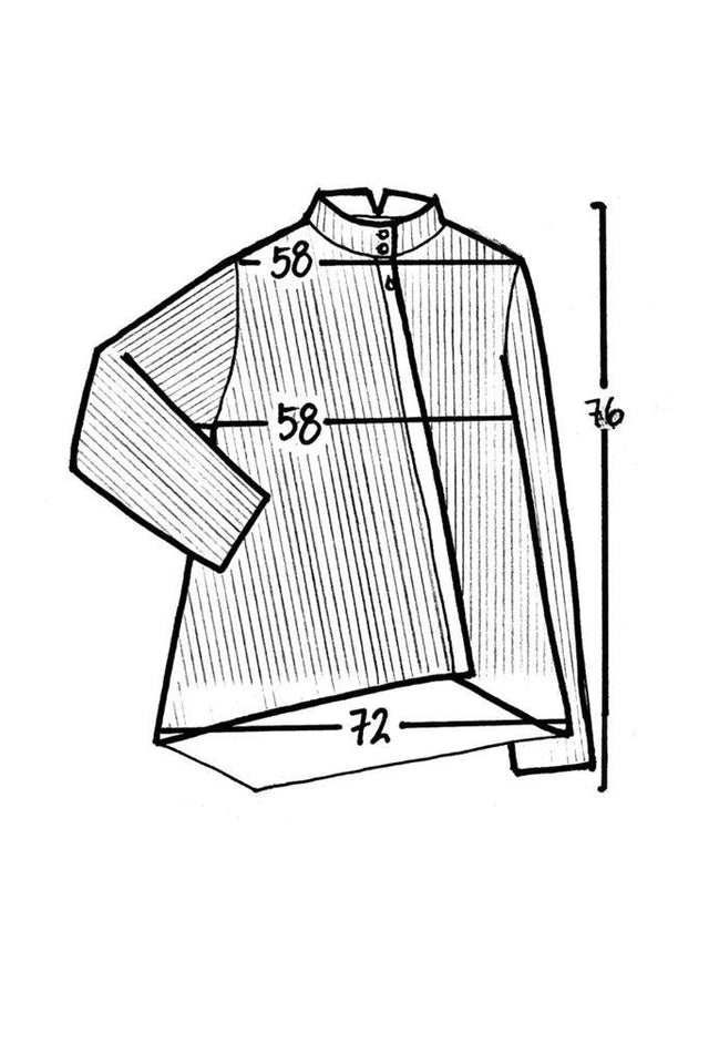 Denne skjorten har et fint snitt og god lengde til både skjørt og bukser. Denne skjorten lukkes med en asymmetrisk knappelukking, som er en vakker detalj på skjorten og gir skjorten et delikat utseende. Denne skjorten har et eksklusivt utseende og strukturen på skjorten er helt fantastisk. Dette er et resultat av japansk design på sitt beste.