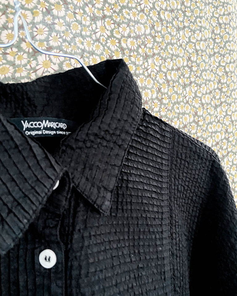 Bedårende YaccoMaricard-skjorte med et vakkert firkantet mønster foran og biser bak. Mønsteret er firkantede stykker som er sydd sammen skråstilt patchwork-stil. Skjorten er her i en fin sort farge.