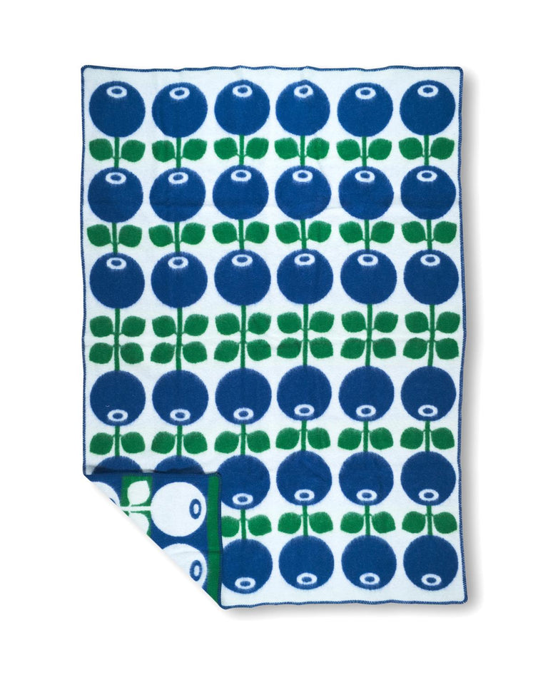 Ullpledd i myk, lekker ull (ull fra Norge). Ullteppet BLÅBÆR RETRO er inspirert av skandinaviske skoger og 60-tallet, perfekt for frosne kvelder. Teppet er jacquardvevd og fargene er omvendt på den andre siden. Vevd i Litauen og laget av fin myk ull fra Norge (480 g/m2).