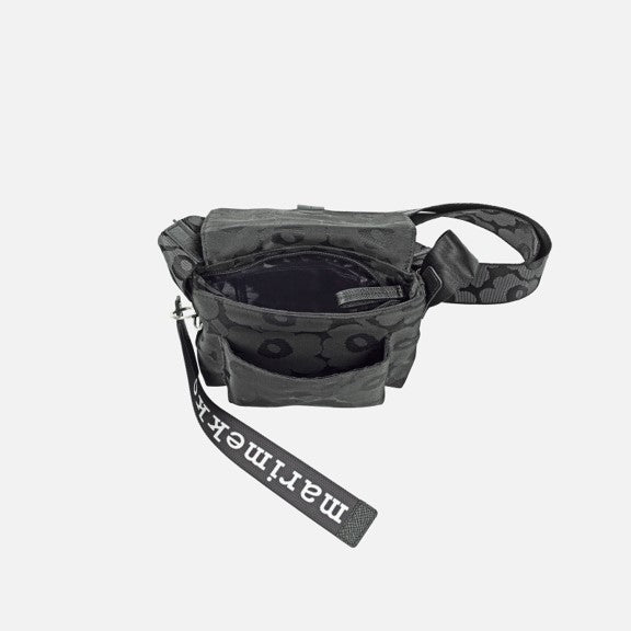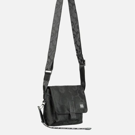 The Unikko pattern Mini Messenger shoulder bag is made of recycled jacquard knit polyester. The bag has one open pocket and a larger open compartment under the front flap. The adjustable shoulder strap has the jacquard knit Unikko pattern. The bag features the Marimekko keychain and leather details.