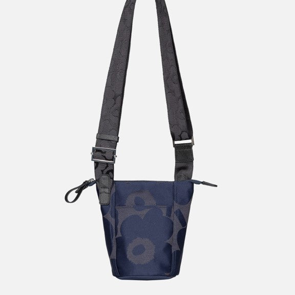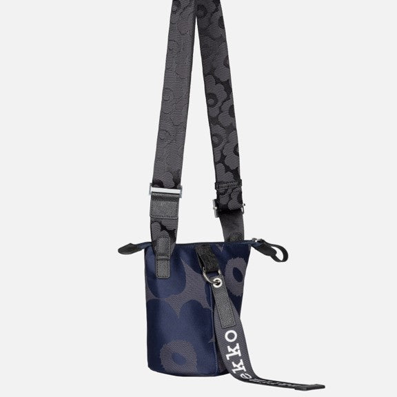 The Essential Bucket shoulder bag is made of recycled polyester with a jacquard knit Unikko pattern. The small bag has a zipper closure and an adjustable shoulder strap. The front features the Marimekko keychain and there is a slip-in pocket in the back. The bag has leather details.