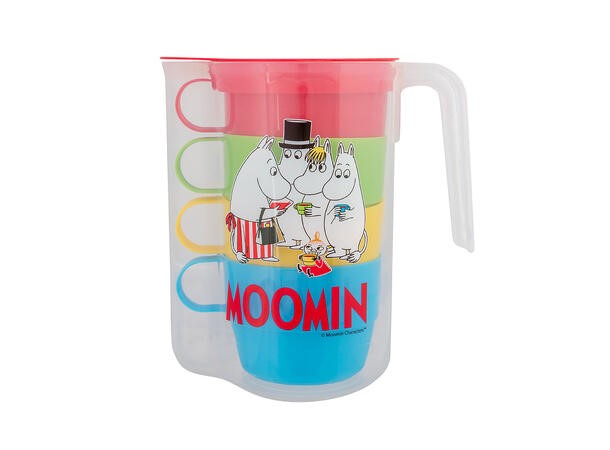 En gjennomsiktig kanne i pp-plast med rødt lokk. Kannen rommer 1 liter og inneholder fire fargeglade kopper i grønt, gult, rødt og blått à 2,25dl. Bare kannen har Mummi-motiv i klare farger. Håndvask anbefales. Tåler ikke mikro.